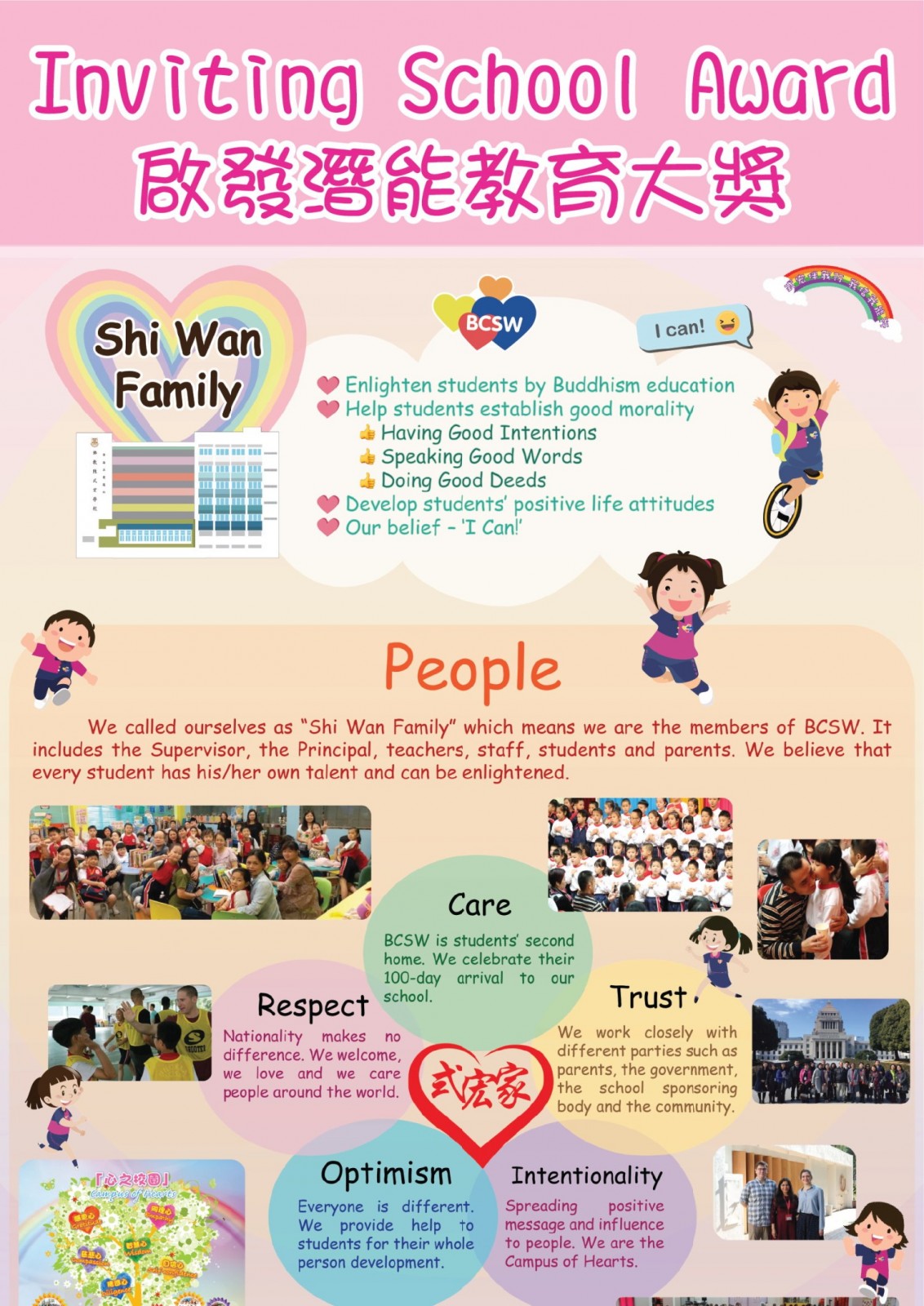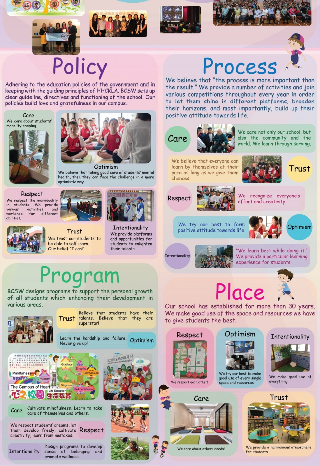 我們透過陶行知先生(1891-1946) 所提倡的「知、情、意、行」的教育理念,讓學生在完成六年的小學生活後,能把「六心」(感恩心同理心慈悲心自信心精進心智慧心) 及覺察心紮根於生命當中學會「覺正」(對事情有正確的價值觀),「行儀」(良好的行為) 。「心如工畫師能畫諸世間」,把正念思維從小植根學子心中,終其一生活出生命姿采立己立人